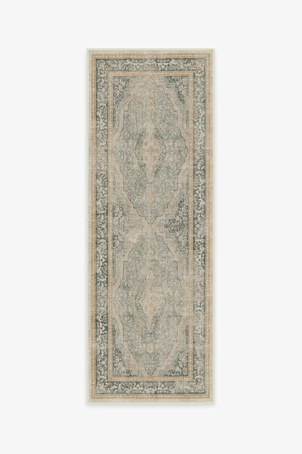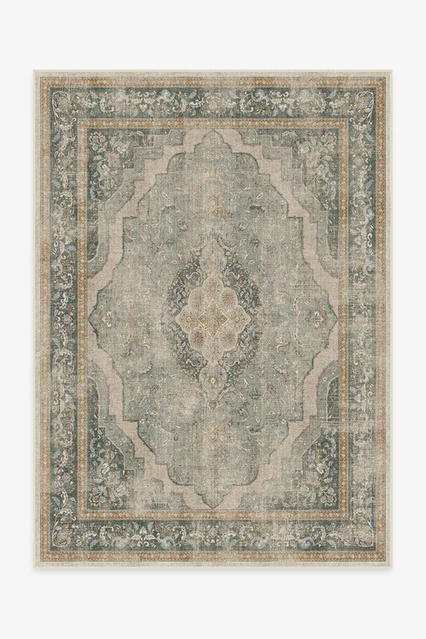 Inspired by classic European rug patterns, our Adeline Natural Sage Rug features a gently distressed diamond medallion with ornate corners and borders in shades of sage green, terracotta, gold, teal, and cream. Made from our water-resistant, stain-resistant, and machine-washable low-pile Chenille material.