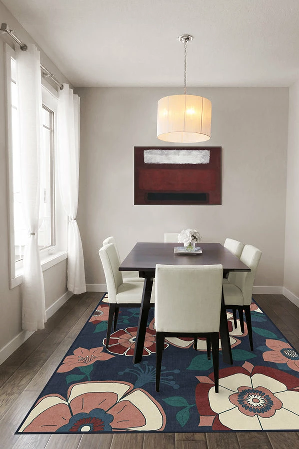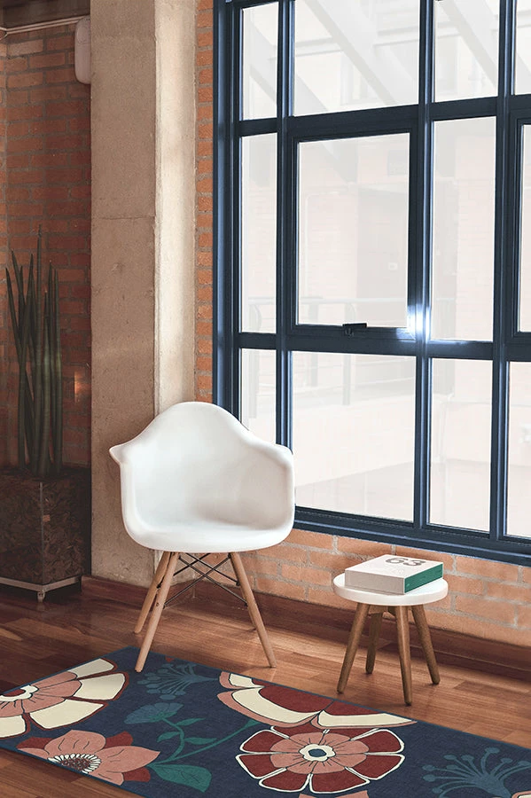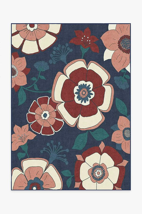 This Audrey Navy rug features a variety of flowers colored in striking shades of pink and red on a field of navy blue.