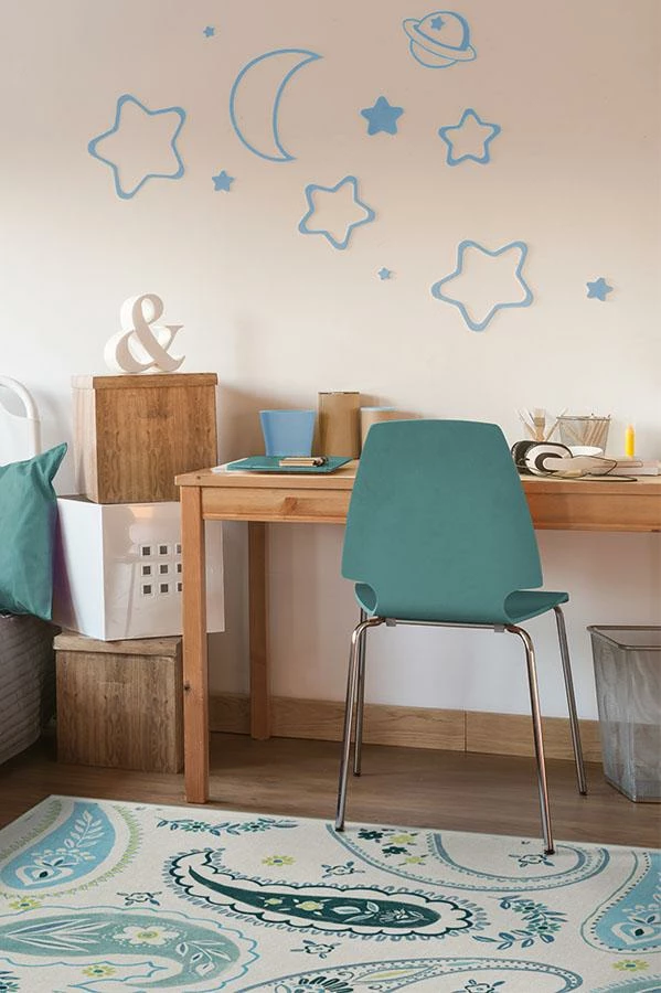 Boteh Blue Rug features a modern paisley pattern with intricate scallop and floral details. Tinted in tones of sea and teal blue with pops of green, this design is created with soft, feathered edges for that nice watercolor effect.