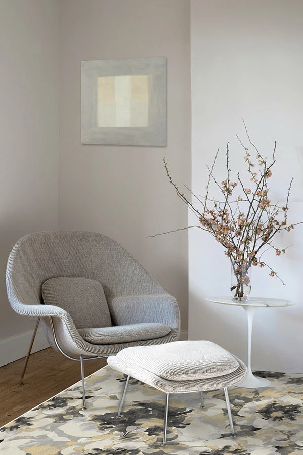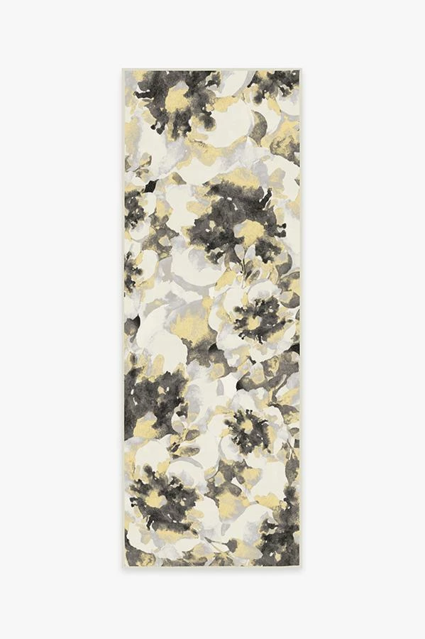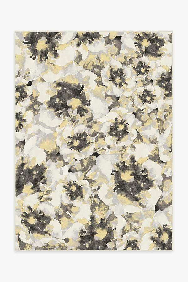 This Buttercup Yellow rug features a watercolor floral motif of overlapping blooms in white and soft yellow with accents of grey.