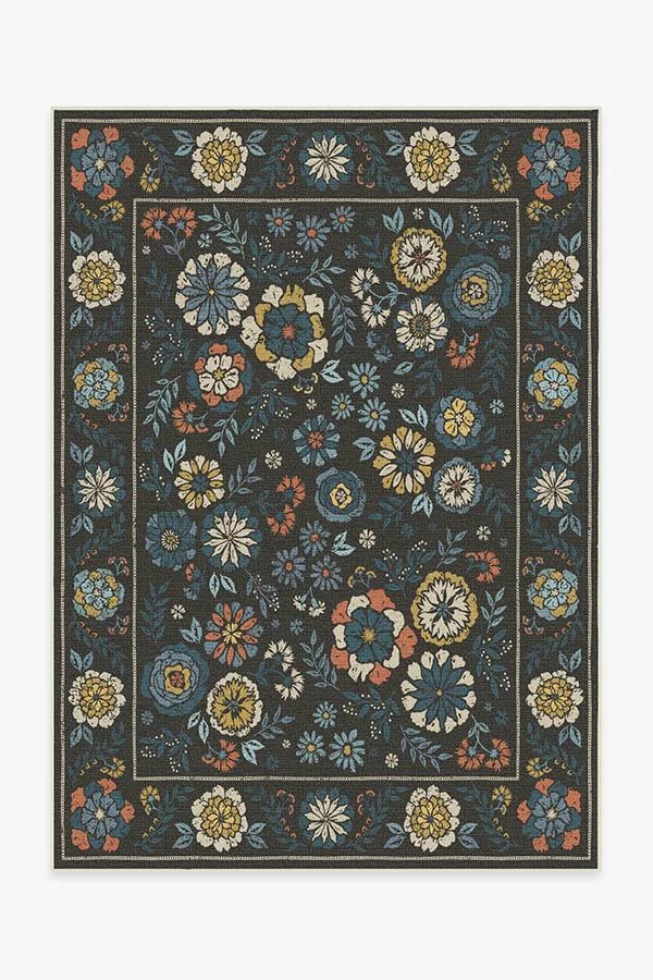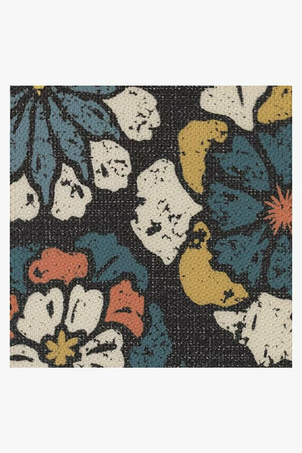 Fun and floral. This colorful outdoor rug features spring flowers in shades of teal, mustard yellow, and terracotta on a black background. Its durable, machine-washable material is perfect for high-traffic areas both outdoors and indoors.