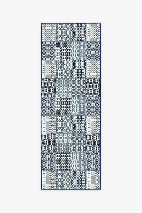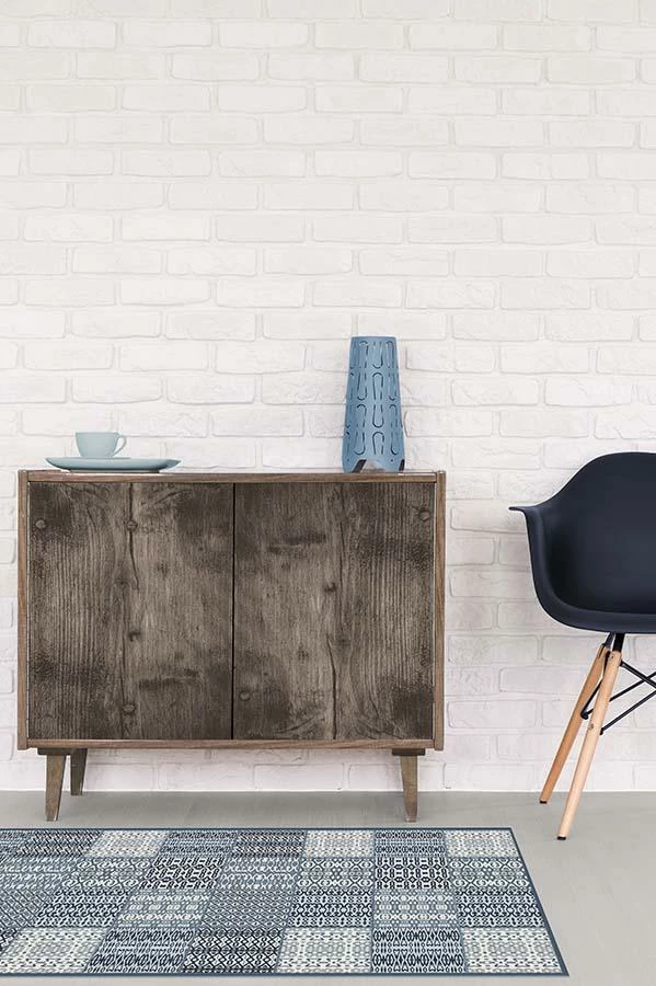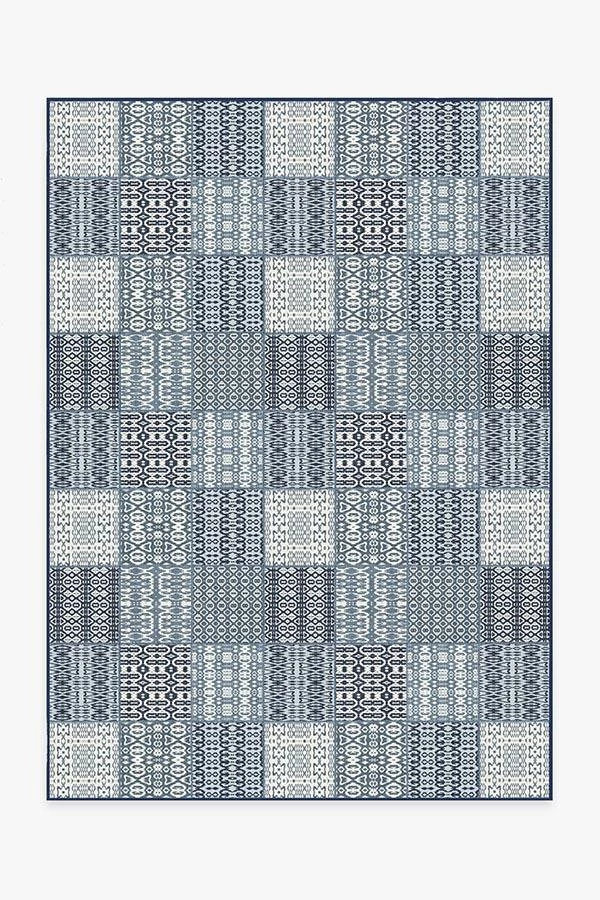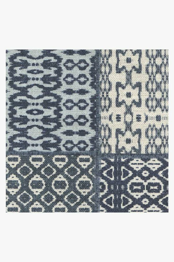 Our Chima Blue Rug showcases a patchwork motif with intricate geometric patterns. Tinted in soothing hues of slate blue and silver with pops of pearl, this decorative accent rug infuses an ecclectic vibe into your home.