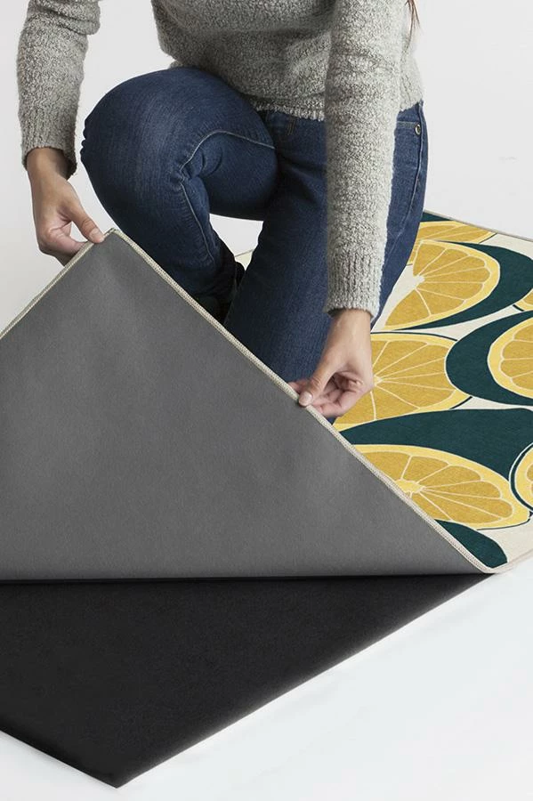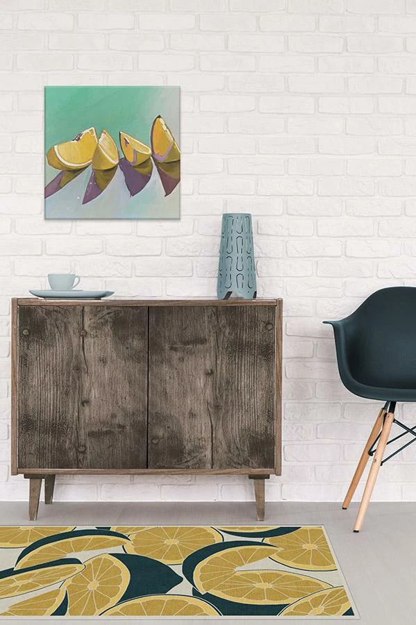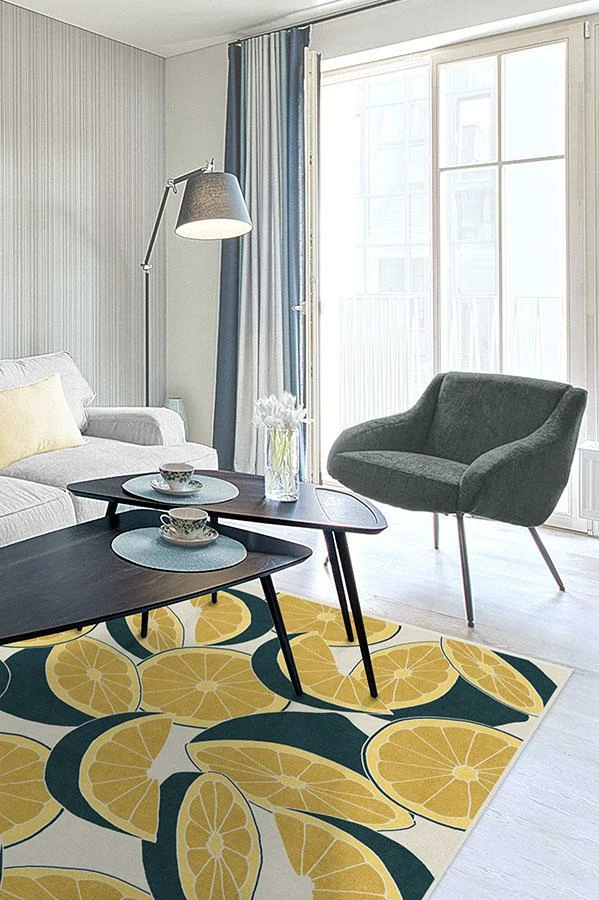 Infuse your home decor with zest and color with our Citrus Teal and Yellow Rug. Oversized lemon slices are hand-drawn in high-contrast tones of yellow and teal blue, adding a striking tropical flair to any room.