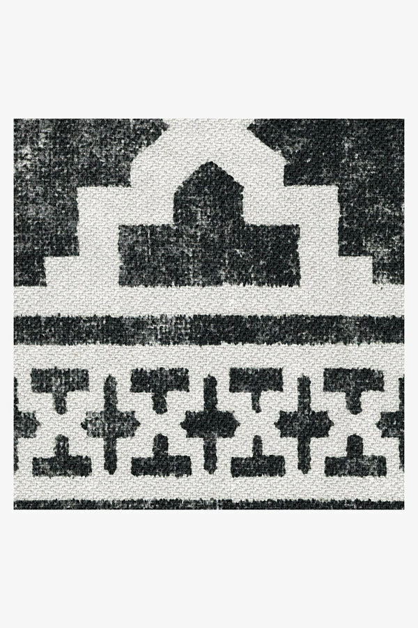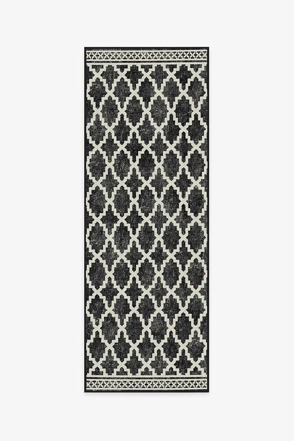 An elegant, statement-making design. Our Cleo Trellis Black Rug features a repeating pattern inspired by the Moroccan trellis motif with bordered ends in a black and white color palette. The extra-durable, machine-washable material is perfect for both outdoor and indoor use, especially high-traffic areas and those exposed to the elements.
