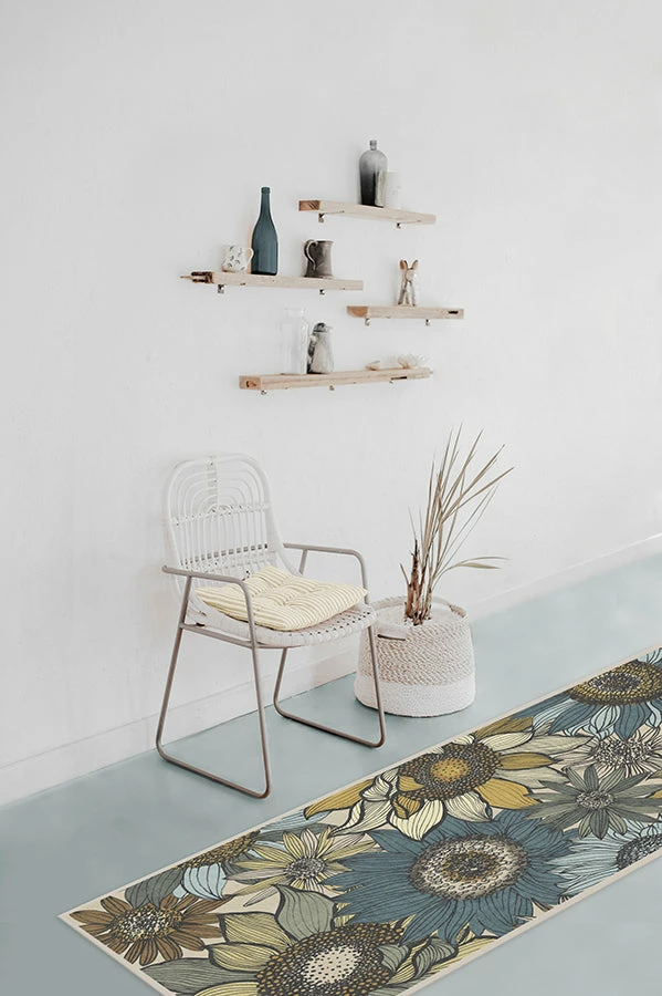 Our Dalilah Capri rug features a retro-feeling floral motif in a palette of warm yellows and pale blues.