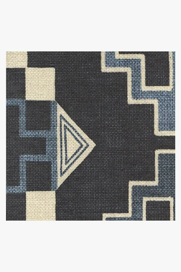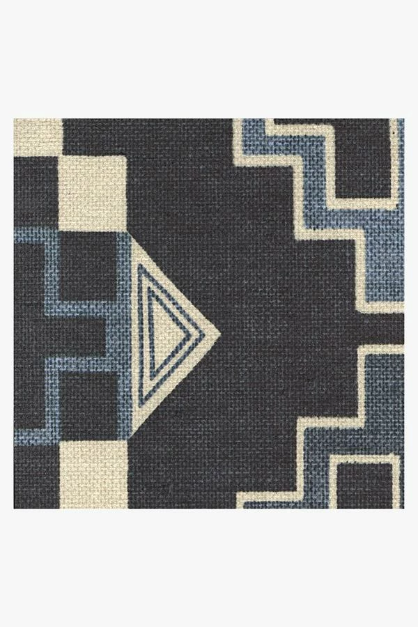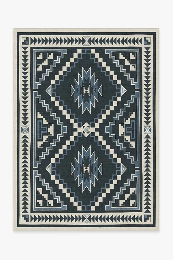 The Desert Ivory Blue Rug features a central diamond pattern surrounded by four corner triangles in striking hues of ivory and slate blue. Inspired by Southwestern motifs, this blue and white geometric rug will make a statement in any room.