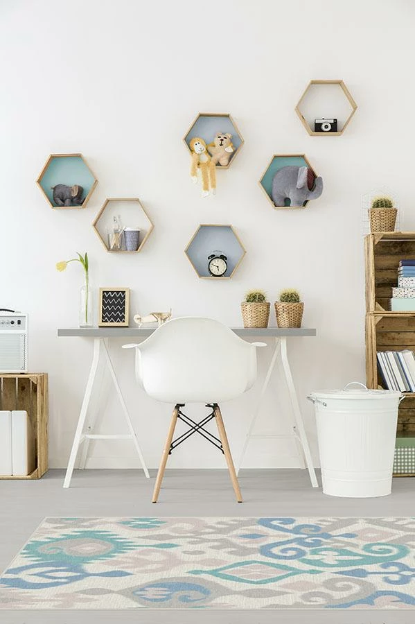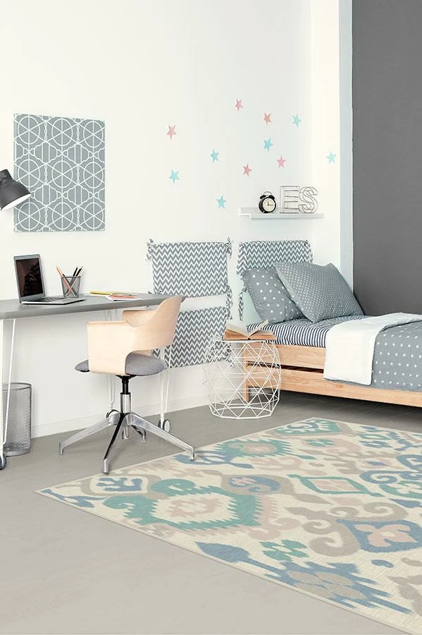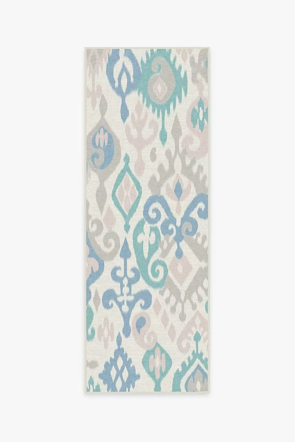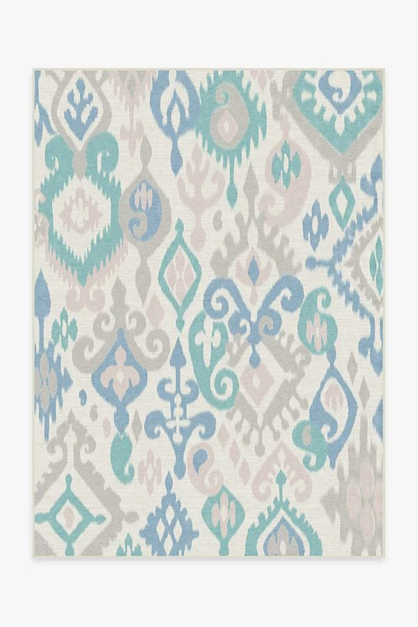 Inspired by the classic ikat motif, Eisley Pastel Rug features a beautifully hand-drawn pattern tinted in a fun and feminine palette of pink and teal blue on pearl. Perfect for kids, teens and tweens, this accent rug lends a youthful bohemian vibe to your home.