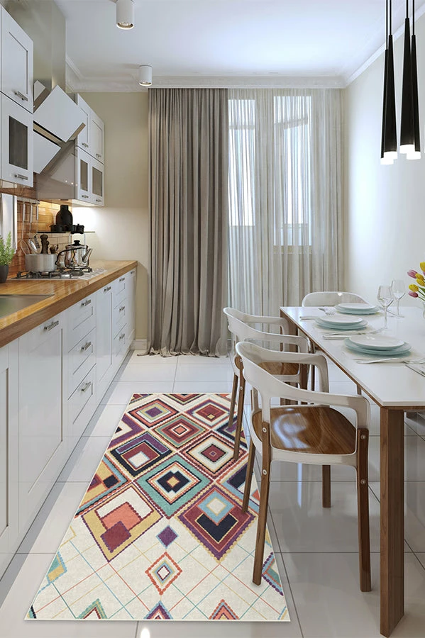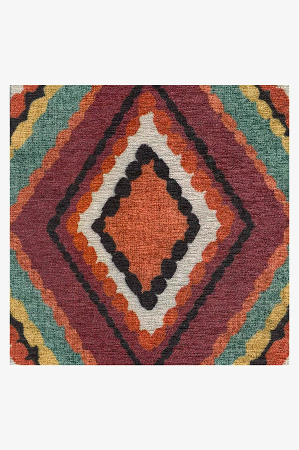 Our Esra Polychrome rug is a total crowd-pleaser and will instantly up the joy of your home interior. Happy hues of Danish yellow, eggplant, garnet, and light rosewood bring to life this gorgeous geometric design of overlapping diamonds. A fun accessory to enliven any room in your urban or suburban home.