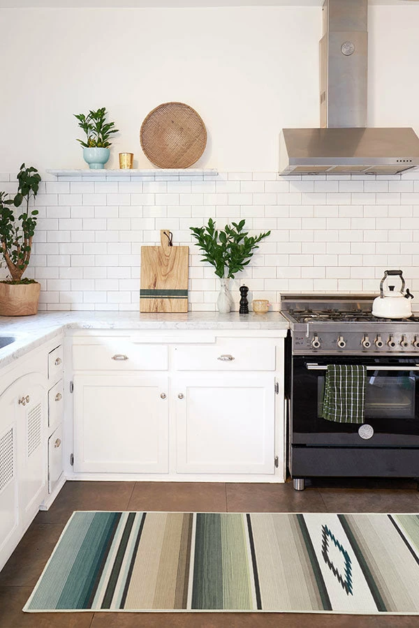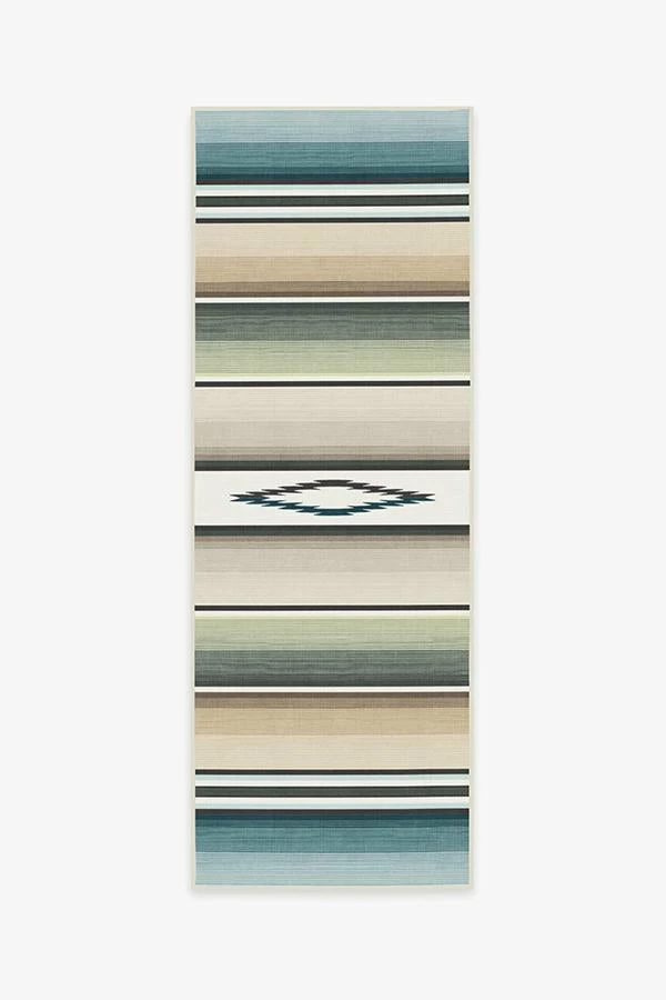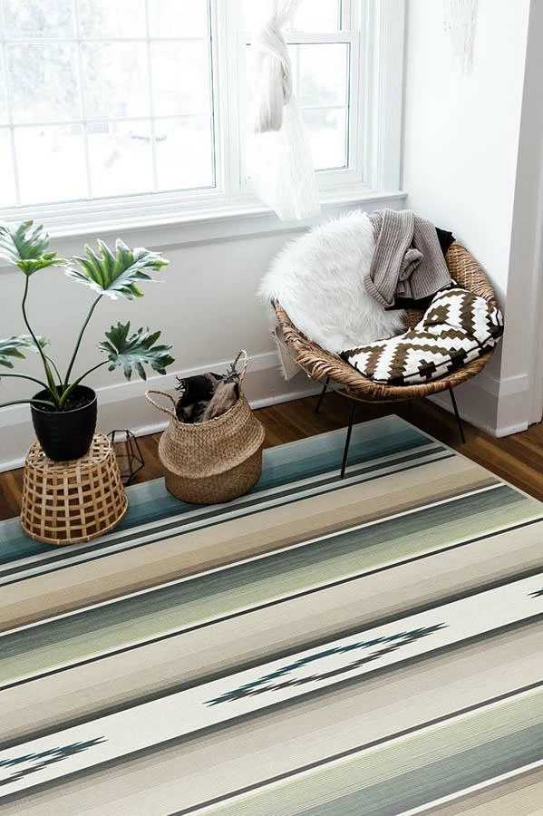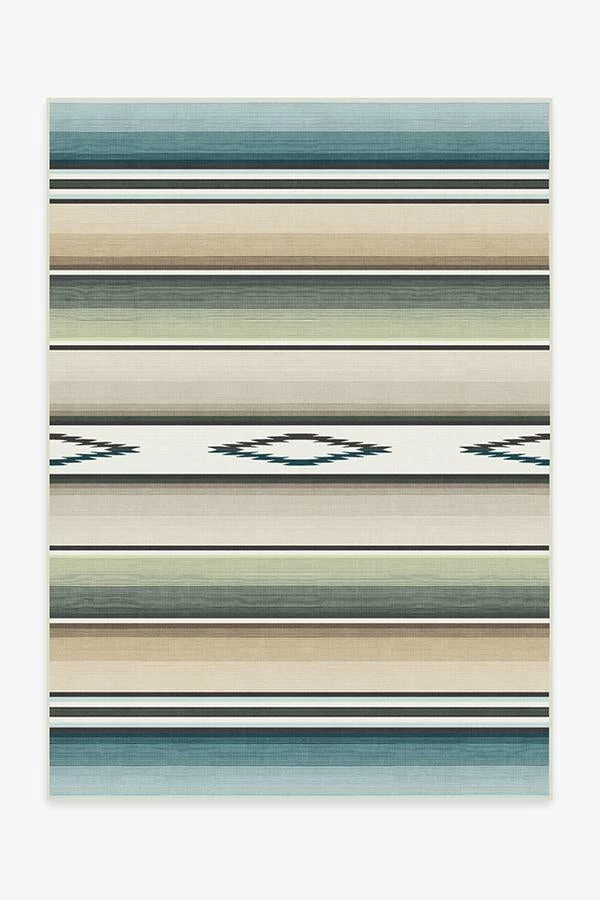 Take your contemporary home decor south of the border with this Falsa Stripes Sage Rug. Inspired by traditional Mexican serape blankets, the striped weave motif is tinted in mellow tones of sage and teal blue with a chic ombre effect.