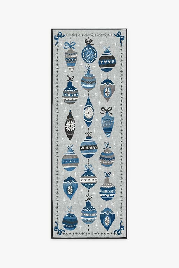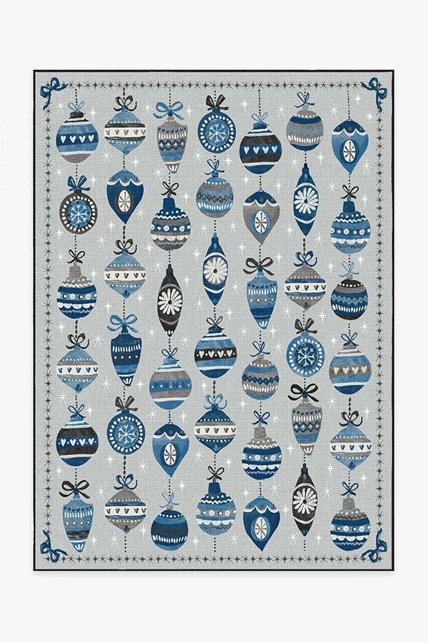 The perfect wintry and whimsical accent for your home. Our Festive Garland Blue Grey Rug features vintage holiday ornaments in a range of blue hues against a calming light grey background. The pattern is complete with a subtle starburst border and adorable blue bows at each corner. The extra-durable, machine-washable material is perfect for both outdoor and indoor use, especially high-traffic areas and those exposed to the elements.
