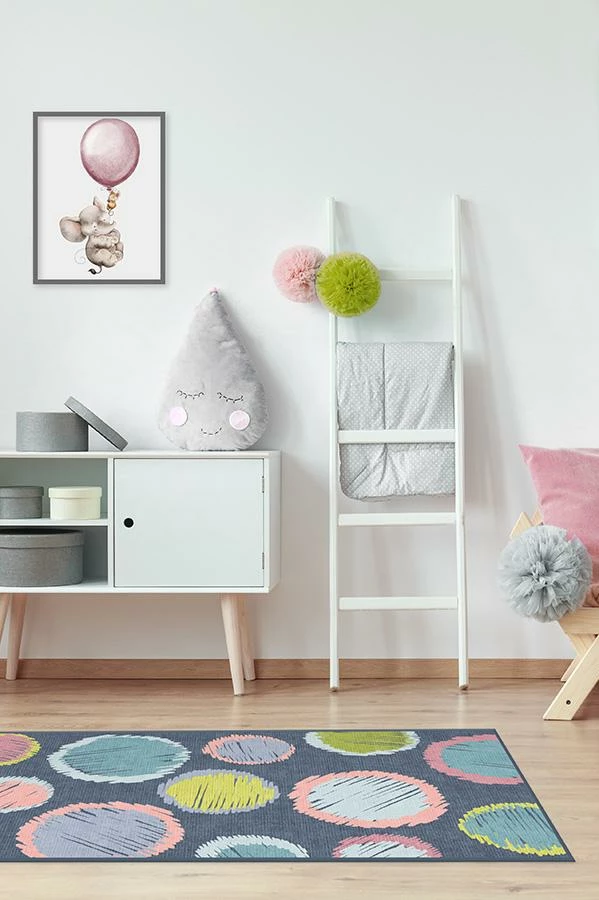 Toss in a touch of fun and color to any child’s room with the Freckles Teal Rug. This design plays up the classic polka dot pattern, created with crayon strokes in happy hues of turquoise blue and cotton candy pink on a background of slate blue.