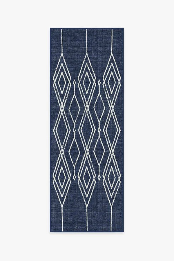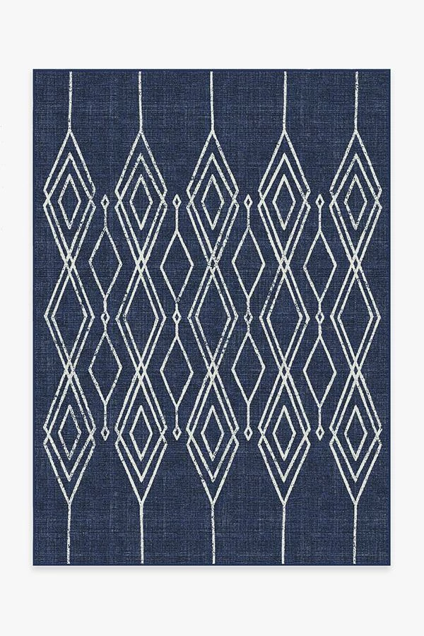 A laidback lattice design. The elongated off-white diamond pattern has a hand-drawn feel that gives this navy outdoor rug a boho vibe. Made with an extra-durable, machine-washable, and fade-resistant material that’ll look good in any indoor or outdoor space.