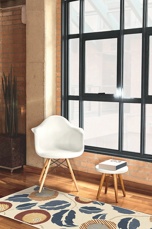 Inspired by Yumeji Takehisa, our Hana Imari rug features a modern-retro floral design colored in beautiful shades of blue and orange on a neutral cream background reminiscent of Imari porcelain.