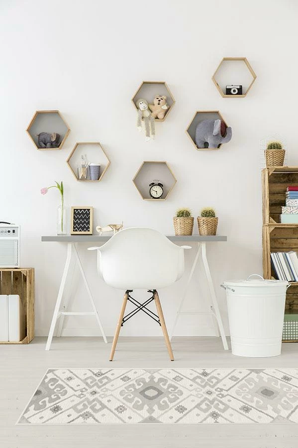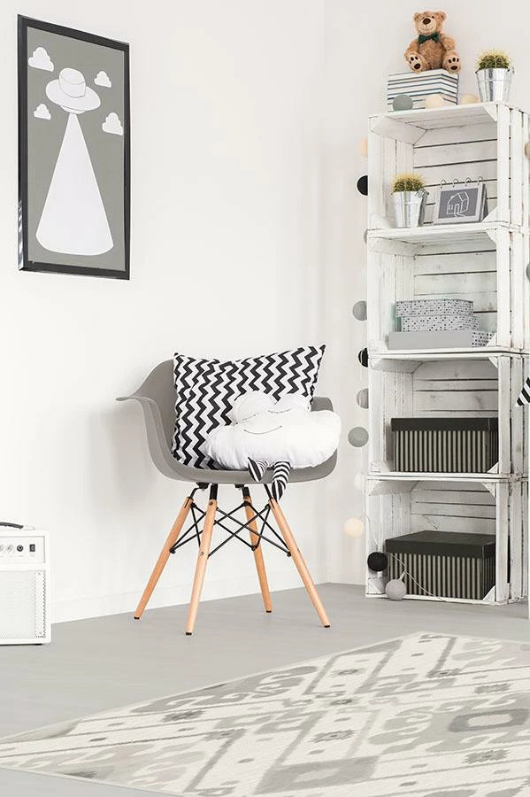 Our Inik Ikat Grey Rug gives off a modern bohemian vibe. Inspired by the ikat dyeing technique, this design features geometric patterns in a neutral palette of grey and silver, making this a gender-neutral design that’s easy to style.