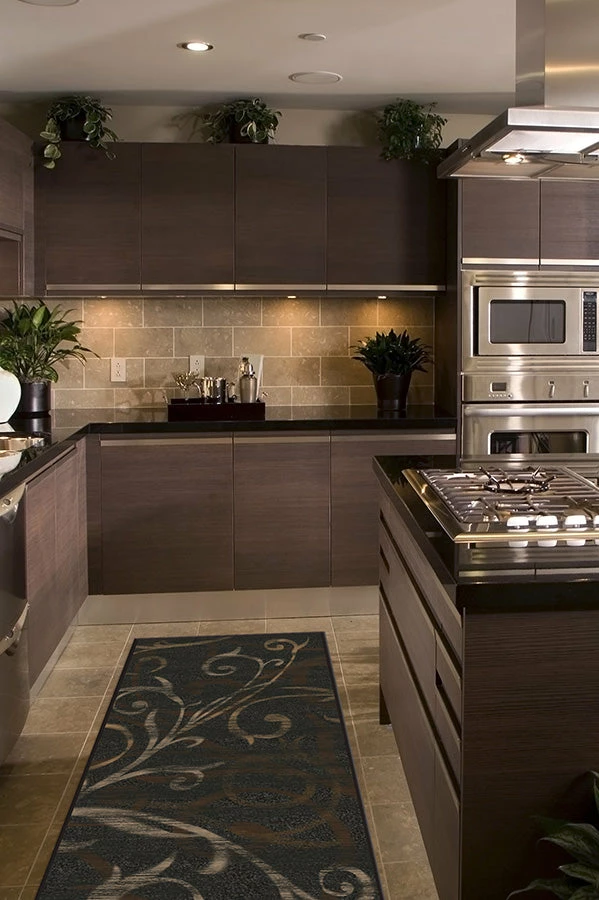 Our stylish Ironwork Black rug will beautifully complement your current home furnishings. The elegant scrollwork design is gently distressed and displayed in warm hues of cacao bean, muslin and golden beige on a background of charcoal and saddle brown. Raise the level of decorative sophistication in any contemporary, modern or traditional home interior.
