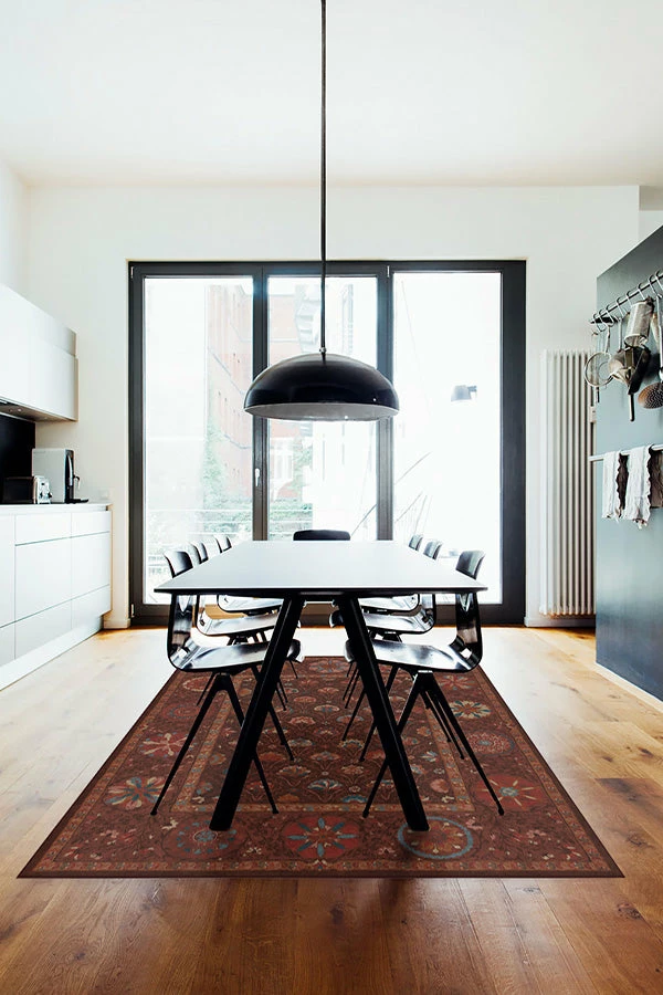 Greet the changing of seasons with our Latiff Autumn Rug. This Persian rug-inspired motif features a band of floral medallions surrounding a field of fanned florets. Tinted in brick red, summer orange, sea blue, and bittersweet chocolate, this accent rug will complement any contemporary, classic, or eclectic-style interior.