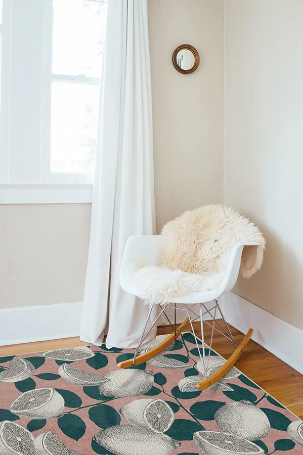 Lemonade Pink Rug offers a modern take on the classic lemon print. Hand-drawn using a pointillism technique, and colored in neutral grey on dusty rose with teal accents, this rug will surely make a style statement in any room.