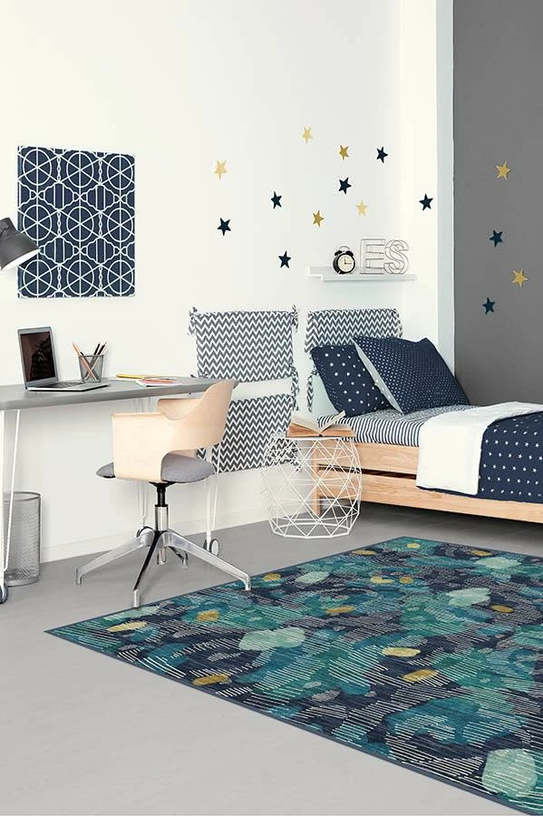 The abstract floral design of our Leona Midnight Blue rug uses overlapping hatch marks and watercolor brushstrokes in blues and pops of soft yellow.