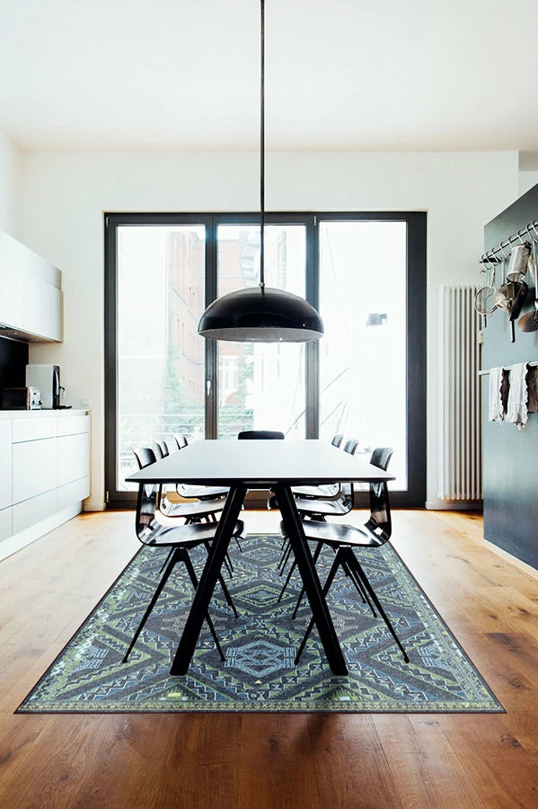 Furnish your home with timeless beauty and richness by laying down our Lunja Midnight Rug. Paying homage to the handwoven Moroccan rug design, this abstract, geometric motif is displayed in a dramatic blend of dark ocean blue, candy apple green, chartreuse, and leaf green.