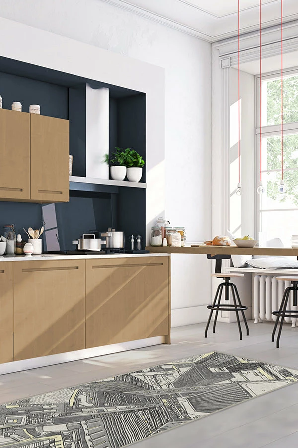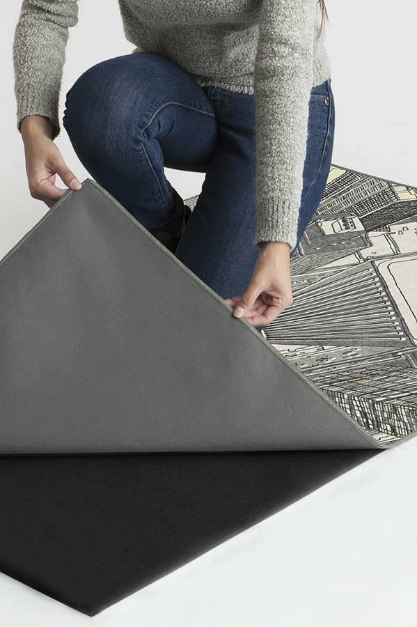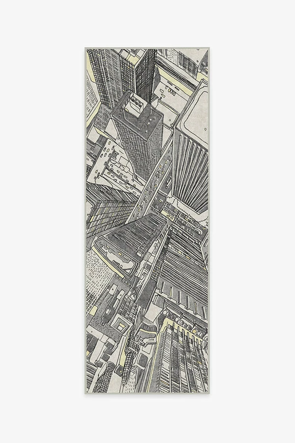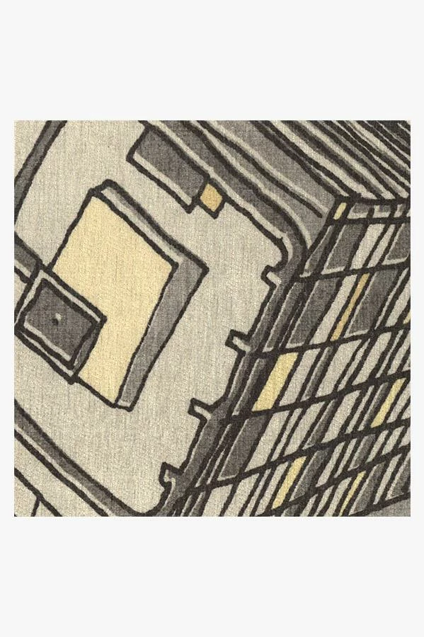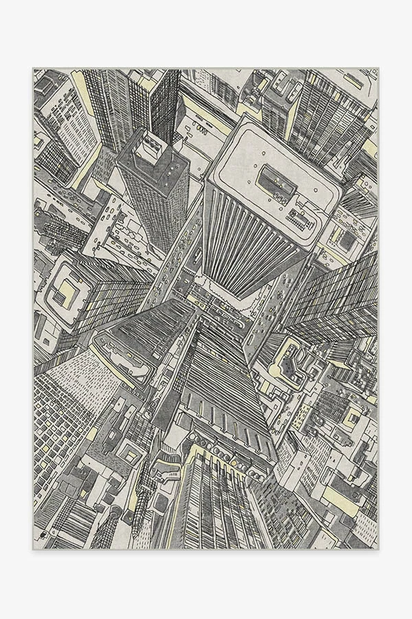 Lux Grey Rug offers a dramatic aerial view of an urban jungle. Featuring elements of modern architecture, hand-drawn in meticulous detail in tones of grey and pops of yellow, this contemporary rug will take your home decor to new heights.