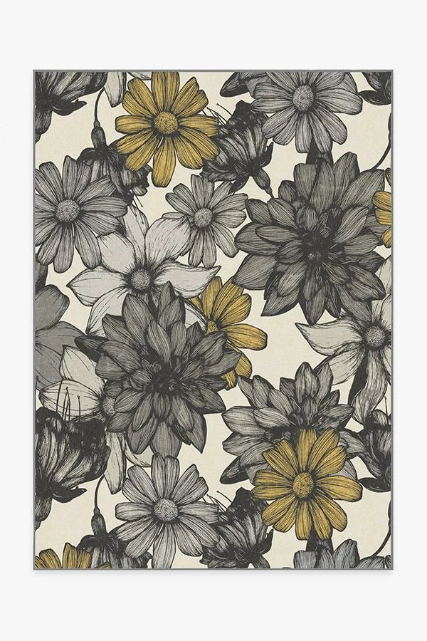 Our vintage-style Mae Grey rug is decorated with a fine-lined floral motif in neutral greys and yellow on a light background.