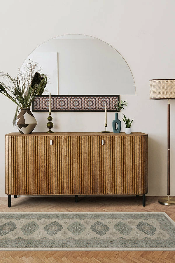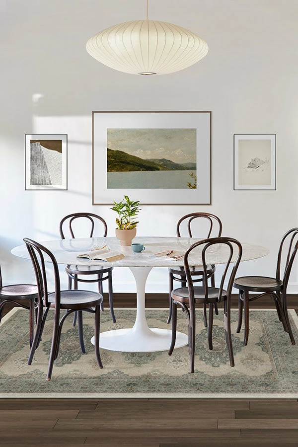 Inspired by traditional European and Persian motifs. Our Maxine Natural Sage Rug features a gently distressed diamond medallion with delicate floral and leaf details in tones of beige and muted green. Made from our water-resistant, stain-resistant, and machine-washable low-pile Chenille material.