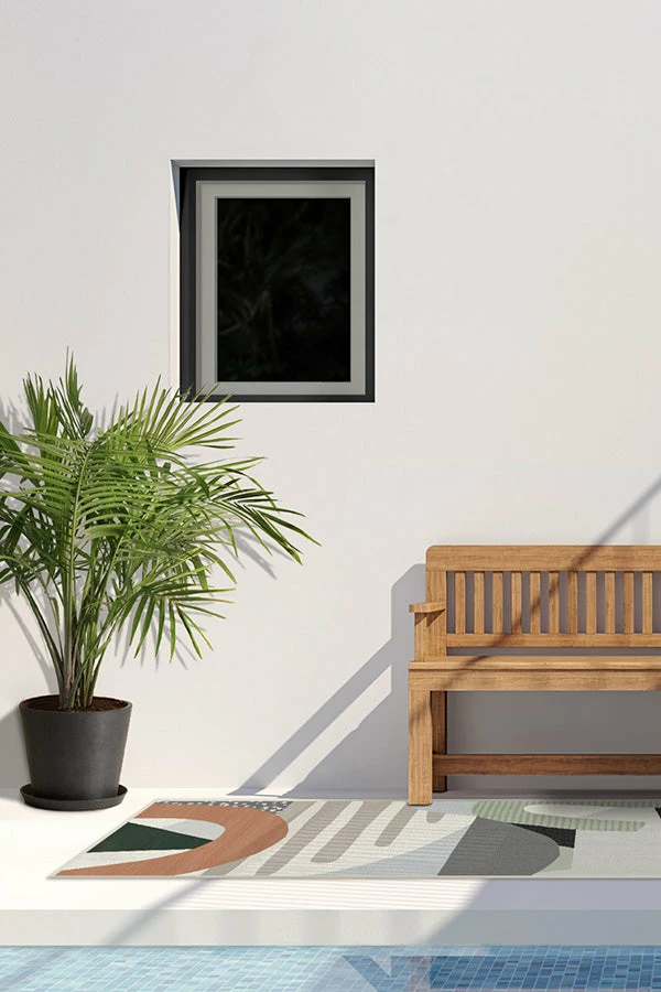 Abstract with an architectural twist. Our Medley Desert Sage Rug features man-made shapes juxtaposed with those found in nature. Shades of dark green and sage, light blue, and terracotta are beautifully balanced with cream and taupe. The extra-durable, machine-washable material is perfect for both outdoor and indoor use, especially high-traffic areas and those exposed to the elements.