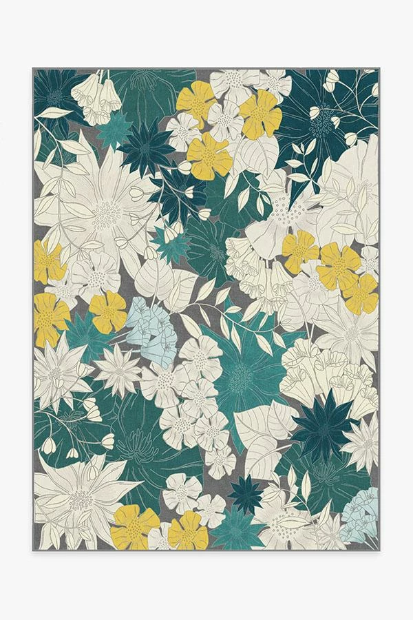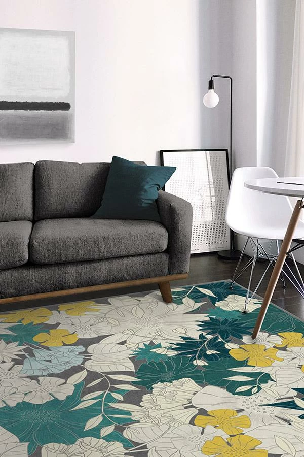 Our floral Nani Teal rug is inspired by Japanese artist and textile designer, Naomi Ito, with a delicate line work motif in blues and creams with a pop of yellow.