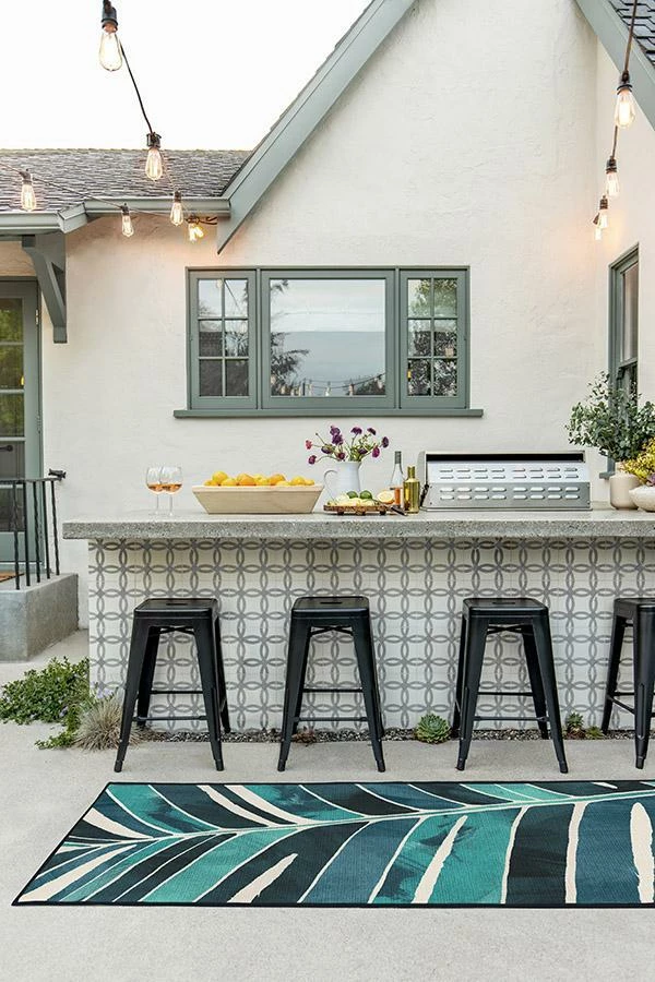 A banana leaf gets an abstract update. Featuring bright shades of teal, blue, and cream, this outdoor rug gives off a tropical vibe. The extra-durable, machine-washable material makes it easy to clean, perfect for your porch, deck, patio, or any indoor our outdoor space.