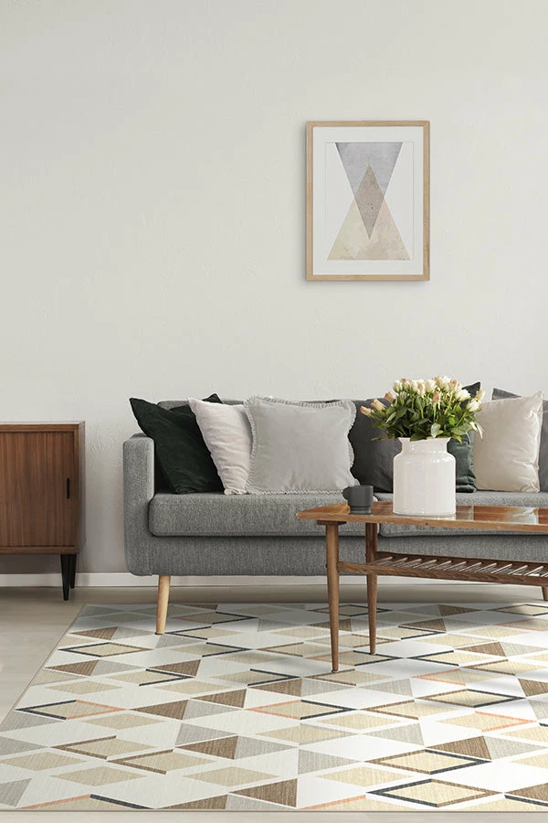 The 60s-inspired repeating diamond and triangle motif of our Pico Diamond Sandstone rug showcases a color palette of browns and tans with a pop of orange.
