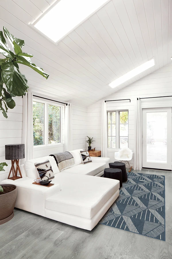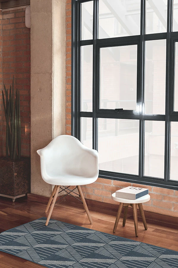 Our Ragazzo Blue rug is an abstract diamond pattern made with a series of fine lines in creme on a slate blue background.