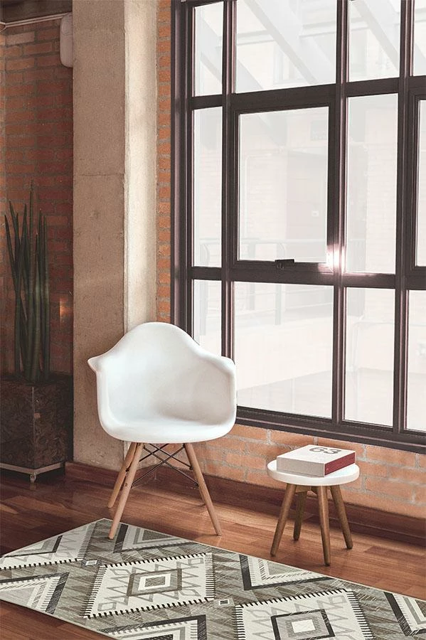 This contemporary Santa Fe Natural Rug features a lightly distressed, Southwestern motif in various shades of grey on a light background.