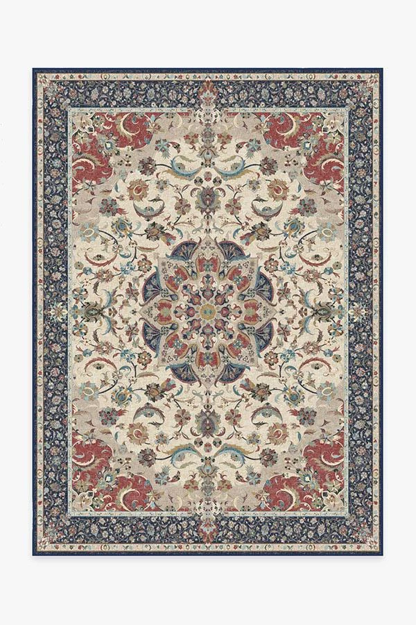 The Sima Royal Blue features a globally inspired floral design. Its leafy floral motif is accentuated by a deep blue border and rich red corner accents.