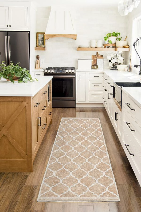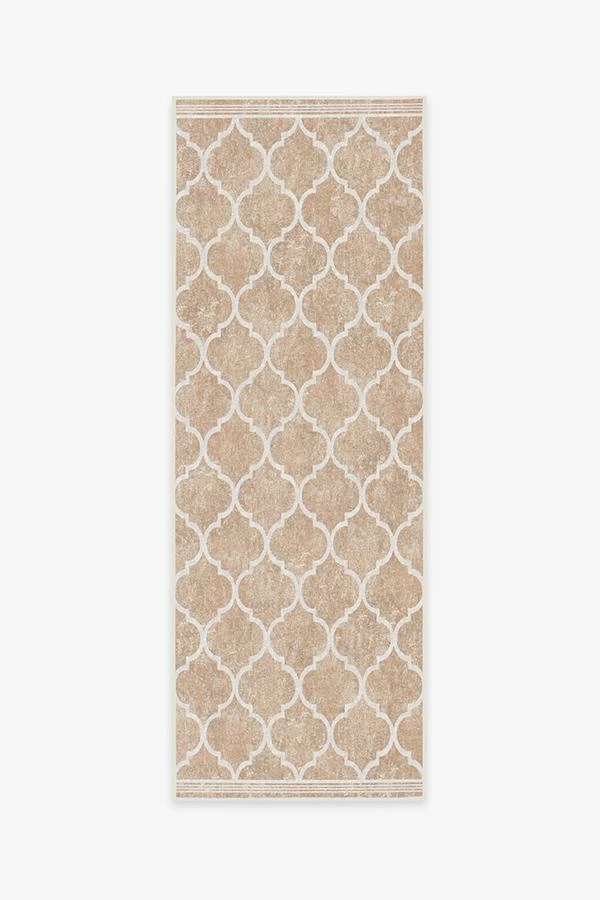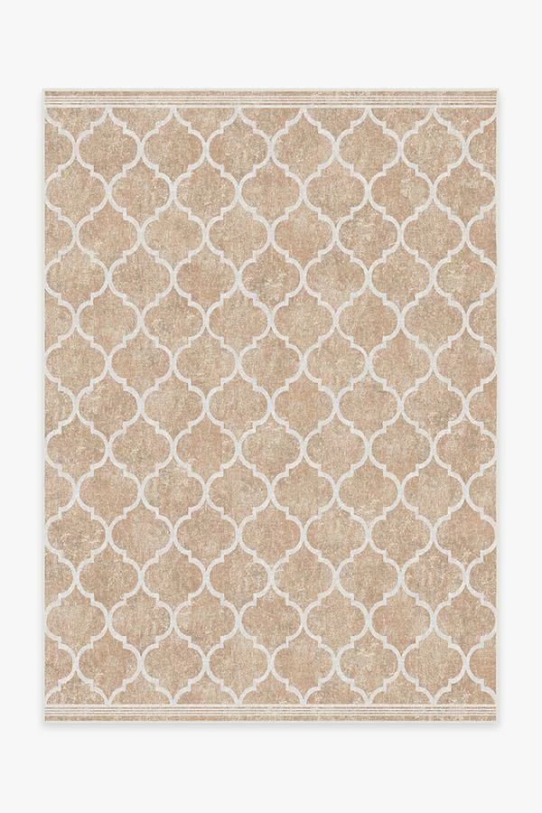 Rosy and warm. Taking a cue from Moroccan rug designs, this rug features a classic trellis pattern in cream on a soft pink-beige backdrop. Water-resistant, stain-resistant, and machine washable.