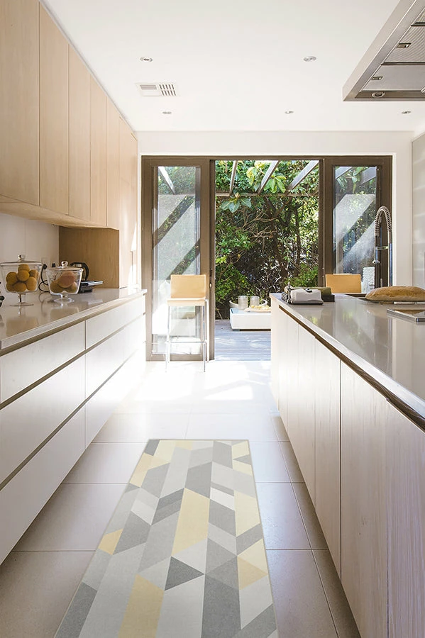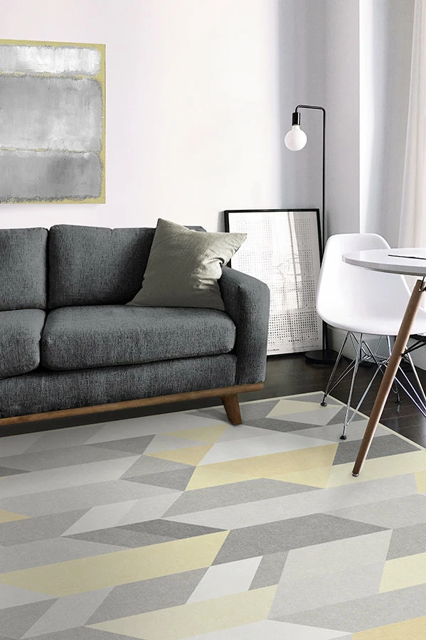 Give your home a pop of color with our Urbano Canary Yellow Rug. This yellow geometric rug features a mix of parallel and diagonal lines in shades of yellow and grey, forming triangles, diamonds, and other interesting shapes that can enliven any space.