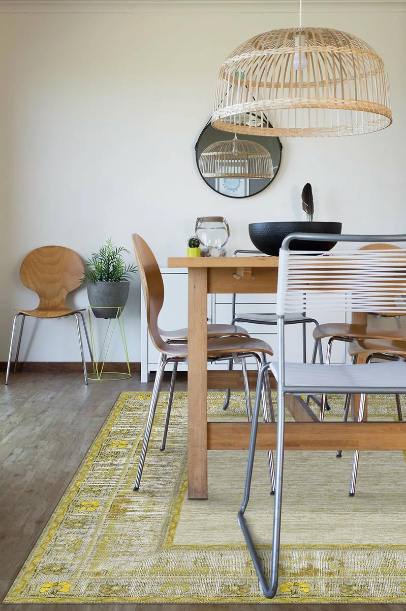 Our Vintage Daisy Bordered Yellow rug will brighten any room. The boho-style design of this vintage yellow rug features a border of distressed daisies that comes to life in a contemporary color combination of yellow, creme, olive, and grey taupe. Style this alongside your modern, contemporary, traditional, or shabby chic furnishings.